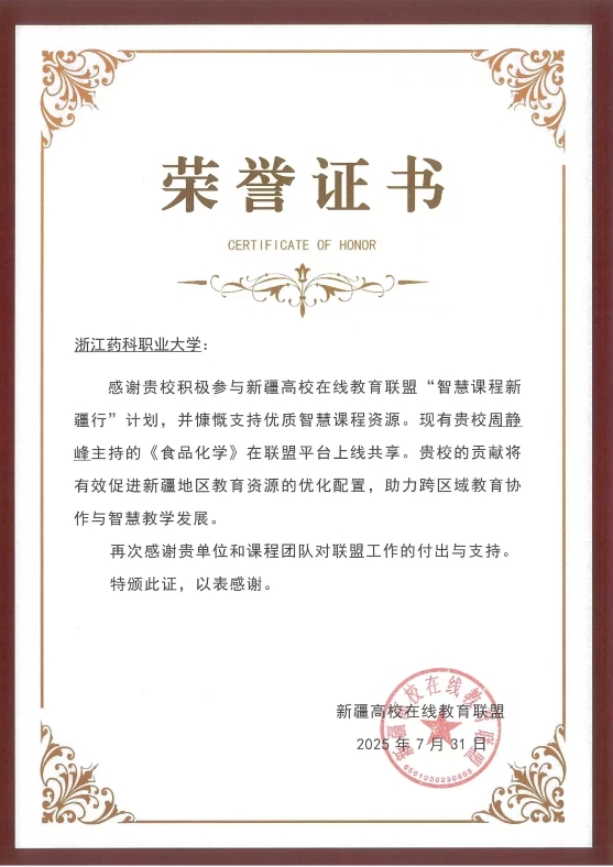 近日,新疆高校在线教育联盟公布第一批“智慧课程新疆行”上线课程名单,我校周静峰教授主讲的《食品化学》课程成功入选教育部首批“智慧课程新疆行”精品智慧课程。我校依托优质教育资源与智慧教学创新实践,积极推进东西部高等教育协作。